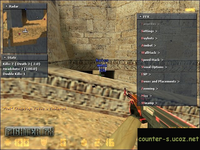 В Fighter FX 10 собраны все самые нужные функции, вот некоторые из них: Aimbot - аим даёт возможность всегда попадать в голову. WallHack (wh) - теперь вы сможете видеть через стены, ящики, двери и т.д. SpeedHack - ускоряется стрельба, бег, перезарядка, удары ножом и вообще все ваши действия в Counter-Strike 1.6 Эти три функции делают этот чит для Counter-Strike 1.6 очень мясным, благодаря ему вы становитесь машиной для убийства, и спокойно можете превратить сервер в мясо, а противников в гору трупов. Также в Fighter FX 10 входит ESP - показывает какое оружие у противников, их HP и броню BOX Esp - обводит всех игроков в квадратики No Flash, No smoke - флэш не слепит, дым не виден вам. Radar Hack - делает ваш стандартный радар более удобным и информативным. Ну и ещё несколько функций, которые вас обязательно порадуют.